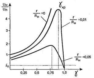 Чтобы получить достаточно протяженный начальный участок и, следовательно, расширить диапазон регулирования выходного напряжения, необходимо уменьшать сопротивление зарядной цепи r. Из рисунка 11. хорошо видно, что невозможно получить бесконечно большие значения напряжений UHпри ограниченном напряжении Un. Практически в стабилизаторах коэффициент заполнения выбирается не более 0,8...0,9, а коэффициент повышения напряжения для самых высоковольтных вариантов - не более 5.