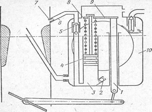 пан 2. В колодце имеется поршень 4, на штоке которого установлена пружина 8. Пружина упирается в планку 9, закрепленную на подвижной стойке 1, которая соединяется с дроссельной заслонкой. В распылителе . ускорительного насоса, расположенного над верхней кромкой диффузора, установлен жиклер 7 с очень небольшим выходным отверстием. В канале, по которому подается топливо к распылителю, размещен нагнетательный клапан 5.