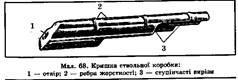 5. Відокремити кришку ствольної коробки (мал. ). Лівою рукою охопити шийку приклада, великим пальцем цієї ж руки натиснути на виступ напрямного стержня поворотного механізму; правою рукою підняти вгору задню частину кришки ствольної коробки і відокремити кришку.