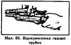 9. Відокремити газову трубку зі сталевою накладкою (мал.). Утримуючи автомат лівою рукою, правою надіти пенал для приладдя прямокутним отвором на виступ замикача газової трубки, повернути замикач від себе до вертикального положення і зняти газову трубку газової камери.