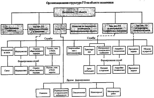 Начальник ГО объекта подчиняется НГО вышестоящего ведомства (министерства, отрасли), а в оперативном отношении - начальнику ГО города (района, префектуры), на территории которого расположен объект. На крупных промышленных объектах, как правило, предусматривается штатный заместитель НГО, являющийся в мирное время начальником структурного подразделения, уполномоченного на решение задач ГО, и основным организатором всех подготовительных мероприятий по ГО. Ему предоставляется право от имени начальника ГО отдавать приказы и распоряжения по вопросам гражданской обороны объекта.