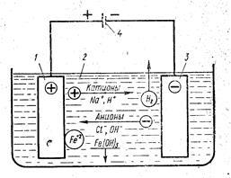 . При подаче на электроды напряжения от источника питания анионы гидроксила и катионы водорода вместе с анионами хлора и катионами натрия вынуждены под действием сил электрического поля перемещаться соответственно к катоду и аноду. Атомы поверхностного слоя электрода-анода 1, получая от движущихся к нему анионов хлора и гидроксила дополнительные отрицательные заряды, превращаются в положительные ионы железа. Последние под действием сложных катодных и анодных реакций взаимодействуют с ионами гидроксила и образуют гидрат окиси железа Fe(OH)3