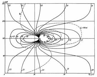 Результат расчёта (т.е. решения прямой задачи) представляется в виде таблиц или а -, -номограмм (рис. 9). Решая затем обратную задачу искомые физические величины определяются путём сравнения экспериментально измеренных значений эллипсометрических углов с теоретическими зависимостями, например от n и d, т.е. с результатами решения прямой задачи. За одно измерение на эллипсометре определяются оба угла и и, следовательно, два любых неизвестных физических параметра исследуемой системы, входящих в уравнение эллипсометрии, при известных остальных величинах.