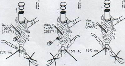 Роботи по спаюванні трубопроводів потрібно проводити лише в приміщеннях, які провітрюються, при наявності засобів пожежегасіння. Під час цих робіт в приміщенні повинна безперервно функціонувати система вимушеної вентиляції, якщо така є в наявності. При її відсутності всі вікна і двері в приміщенні повинні бути відкриті настіж. Для виконання робіт по зварюванні і спаюванні повинні бути задіяні лише кваліфіковані спеціалісти. Перед початком робіт необхідно переконатись, що в трубопроводах відсутні вибухонебезпечні суміші і олива. Труби перед спаюванням і під час пайки необхідно продувати сухим азотом з витратами не менше 0,12·10-3