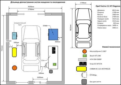 Усі прилади та стенди відображені у ескізі дільниці діагностування систем мащення та охолодження двигунів автомобілів OpelVectra 2.2 ATElegance.