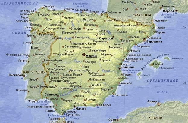 Испания расположена на юго-западе Европы и занимает около 85% территории Пиренейского полуострова, и также Балеарские острова в Средиземном море и Канарские острова в Атлантическом океане. Общая площадь страны - 504,750 кв.км. Включая острова и анклавы. Земля: 499,400 кв. км. Вода: 5,350 кв. км Страна граничит с Францией, Португалией, Андоррой и английской колонией Гибралтар. Испания добивается возвращения суверенитета над Гибралтаром. Под управлением Испании находятся города Сеута и Мелилья (в Северной Африке, на территории Марокко) и острова Велес-де-ла- Гомера, Алусемас, Альборан и Чафаринас. Мадрид - столица и географический центр Испании. Территория страны на востоке и юге омывается Средиземным морем, на севере и западе - водами Атлантического океана. Испания находится на пересечении важных морских и воздушных путей, связывающих Европу с Африканским и Американским континентами. Большая часть страны покрыта плоскогорьями и горными хребтами, вокруг которых располагаются равнины и низменности. Леса занимают только 10% территории Испании. Самая высокая вершина: Pico Teide (Tenerife) на Канарских Островах 3,718м. Самая высокая вершина на континенте: Мупасен в горах Сьерра-Невады - 3,478м. Самая низкая точка: Атлантический океан 0м. Самая длинная река: Эбро - 928км (впадает в Средиземное море). Береговая линия: 4,964км