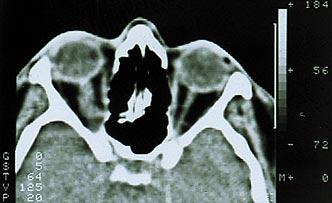 Рис. 2. Компьютерная томограмма той же больной. Видна тень увеличенного зрительного нерва.