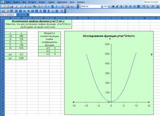 + bx + c. Автоматически меняются значения в ячейках В6:В10, а соответственно график функции тоже автоматически меняет свой вид. Также в ячейках В12, В13 отображаются координаты вершины.