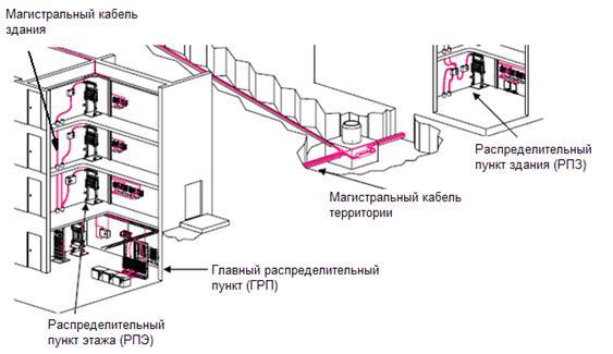 Объединение горизонтальных подсистем этажей здания осуществляется с помощью вертикальной кабельной подсистемы через РПЭ, размещаемые на этажах. РПЭ представляет собой монтажный шкаф с установленными кроссовыми и коммутационными патч-панелями, на которых разделываются кабели от рабочих мест, и активным оборудованием – концентраторами или коммутаторами. РПЭ выступает как подчиненный для распределительного пункта здания (РПЗ) и служит для связи горизонтальных кабельных подсистем и основной вертикальной кабельной подсистемы здания.