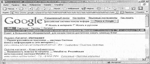 Поиск информации в русскоязычной части Интернета с помощью наиболее поисковых систем: Google, Rambler, Апорт, Yandех и файловой поисковой системы Research можно производить с использованием интегрированной поисковой системы Goоgle.ru. Для этого достаточно ввести ключевые слова в строку поиска, с помощью переключателей установить тип необходимой информации и щелкнуть по кнопке с названием поисковой системы Google.ru Для этого достаточно ввести ключевые слова в строку поиска, с помощью переключателей установить тип необходимой информации и щелкнуть по кнопке с названием поисковой системы.