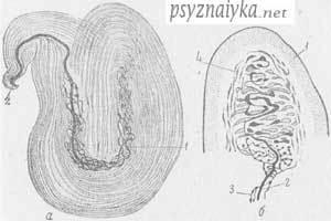 а - разрез Фатер-Пачиниева тельца кожи человека: 1 - внутренняя колбочка; 2 - нервное волокно. б - разрез тельца Мейснера из сосочка кожи пальца человека: 1 - эпителий; 2,3 - нервные волокна; 4 - капсула.[1]