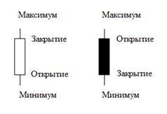 Японские свечи состоят из тела свечи и верхней/нижней тени. Верхняя и нижняя граница тени отображает максимум и минимум цены за соответствующий период. Границы тела свечи отображают цену открытия и закрытия. Если цена закрытия выше, чем цена открытия т.е. цены выросли, то рисуется белая свеча. Если цена закрытия ниже цены открытия - цены упали, то тело свечи черное. Глядя на графики свечей, становится понятным происхождение названия «свечи»: отдельные линии на этих графиках действительно похожи на свечи с торчащими из них концами фитиля. Если у свечи отсутствует верхняя тень, говорят, что у нее срезана вершина (shaven head). Если у свечи отсутствует нижняя тень, говорят, что у нее срезано основание (shaven bottom). На рисунке 1.8 показаны модели белой и черной японской свечи.