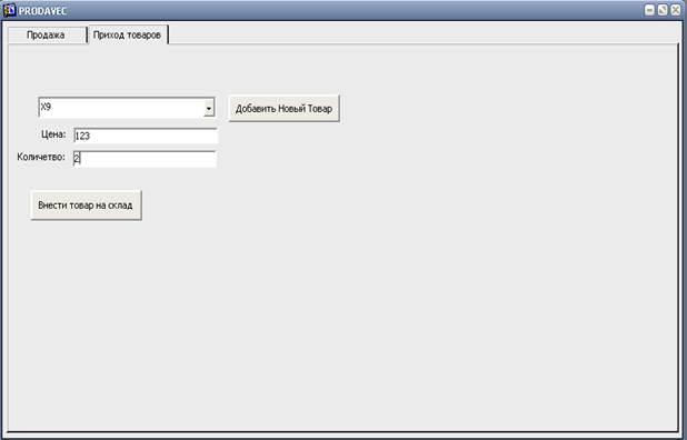 На вкладке «Приход товаров» продавец может добавить товар, выбрав его из списка и введя закупочную цену и количество. Если необходимый товар отсутствует в списке, его можно добавить, путем нажатия кнопки «Добавить Новый Товар».