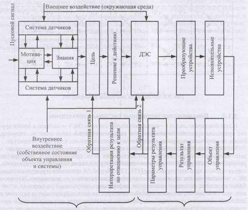 Под целью понимается идеальное, мысленное предвосхищение результата деятельности. Продолжая активно оценивать информацию об окружающей среде и собственном состоянии системы, в том числе объекта управления, при сопоставлении вариантов достижения цели можно принять решение к действию.