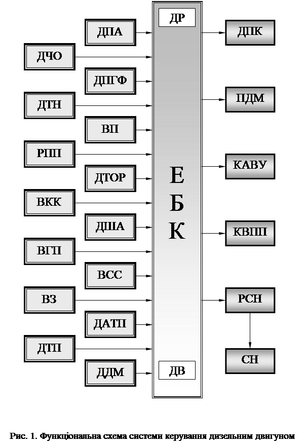На рис. 1 показана функціональна схема системи керування дизельним двигуном типу Bosch EDC. Позначення функціональних блоків на схемі відповідають скороченням у табл.2 (у дужках).