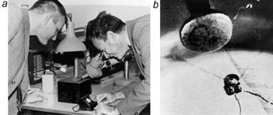 Рисунок 4. На фото (a) Р. Фейнман (справа) рассматривает с помощью микроскопа сделанный микромотор, размером 380 мкм, показанный на рисунке справа. Вверху на фото (b) показана головка булавки.