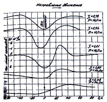 Опыты показывают, что при относительно небольшой скорости перемещения груза наблюдается уменьшение ординат кривой прогибов под грузом, при сохранении общей формы кривой деформации. По мере увеличения скорости движения груза на форме кривой изгиба ледяного покрова сказывается влияние волновых движений воды под ледяным покровом.