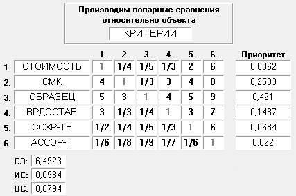 . Выбираются основные критерии выбора поставщика, далее работниками службы закупок или привлеченными экспертами устанавливается их значимость экспертным путем. Например, допустим, что предприятию необходимо закупить товар, причем его дефицит недопустим. Соответственно, на первое место при выборе поставщика будет поставлен критерий надежности поставки. Удельный вес этого критерия будет самым большим (Табл.№1).