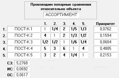 Рис.19. Таблица попарных сравнений и основные показатели для широты предлагаемого ассортимента.