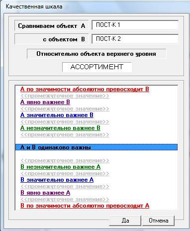 Рис.20. Итоговый результат попарных сравнений для широты предлагаемого ассортимента.