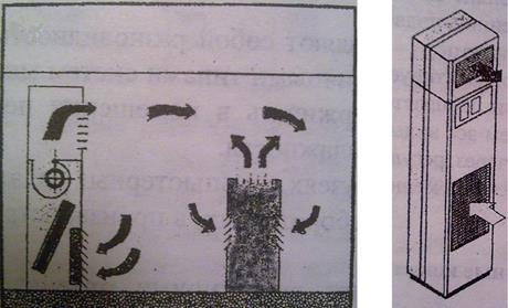Кондиционер с воздушным охлаждением, состоящий из двух блоков: внутреннего блока (собственно кондиционера), в котором расположены компрессор, испаритель, вентилятор и автоматика; внешнего блока – выносного конденсатора или теплообменника. Воздух подается сверху непосредственно в помещение (см. рисунок 3.1), а забирается через лицевую панель.