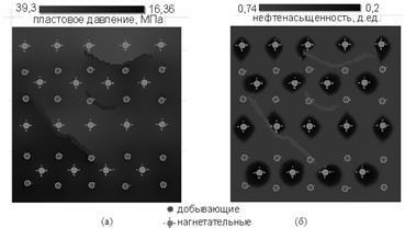 Рисунок 3 - Карты текущего пластового давления (а) и текущей нефтенасыщенности (б) по варианту 1 (стандартная пятиточечная система размещения скважин)