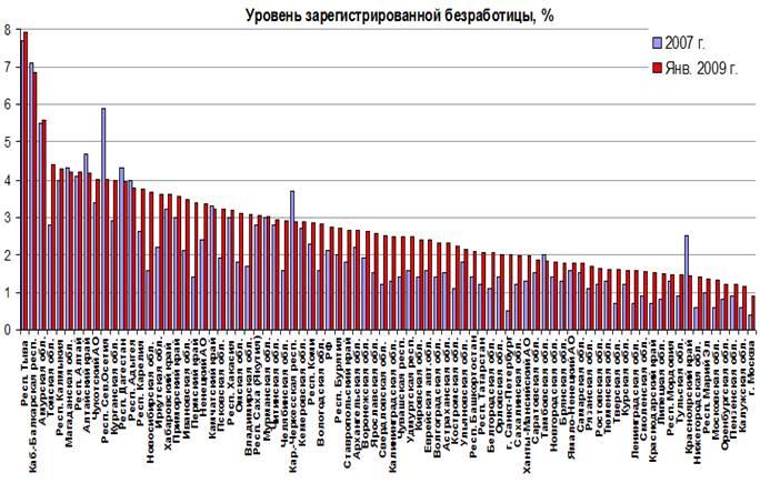 Табл. №1 Уровень зарегистрированной безработицы в регионах России за 2007 и 2009 года.