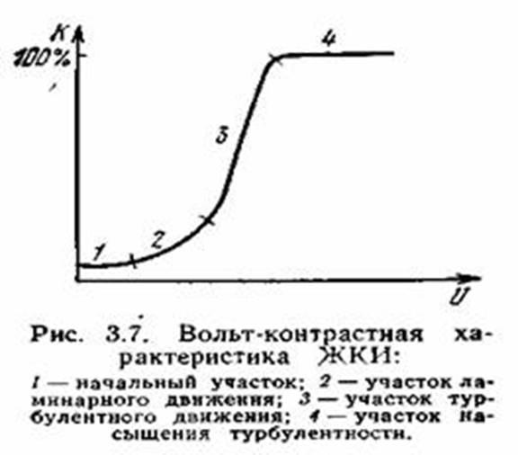 При некотором значении тока проводимости возникает состояние турбулентности, разрушающее ранее упорядоченную структуру ЖК. Беспрерывные хаотические изменения показателя преломления участков жидкости вызывают рассеяние света (отсюда и название эффекта), внешне проявляющееся как помутнение ЖК. Вольт-контрастная характеристика ЖКИ представлена на рис. 3.1.