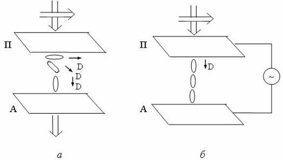 В настоящее время наиболее распространены индикаторы, использующие полевой твист-эффект (от англ. twist - закручивание). Работа ячейки со скрещенными поляризатором П и анализатором А показана на рис. 3.4.