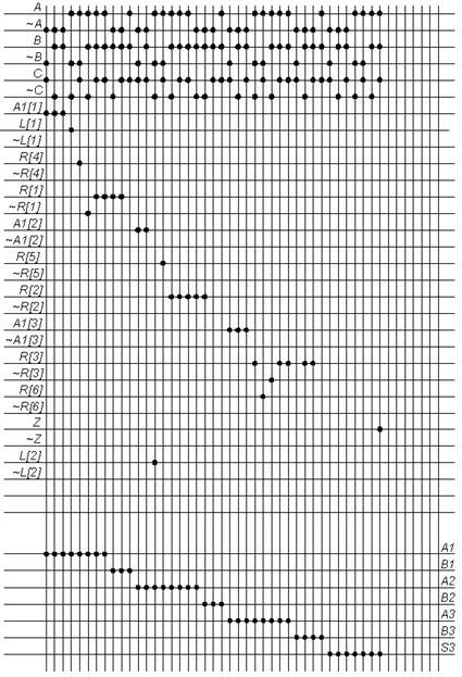 y4: R:= (A2(1:2)&R(1:2).~R(3:4).A2(5:8))