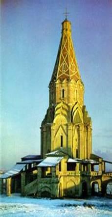 Волей безвестного гения с крутого берега Москвы-реки взметнулся ввысь храм невиданной смелости и изумительной красоты. Словно каменные корни, раскинулись по земле живописные марши его лестниц. С предельной напряженностью устремился к облакам его могучий крестообразный в плане "столп", увенчанный ярусной системой убывающих кокошников. Подобно стреле неудержимо рвется ввысь его одетый в каменную сетку гигантский шатер, опирающийся на стройный восьмерик. И уже совсем растворяется в воздухе его небольшая, почти незаметная главка, увенчанная крестом.