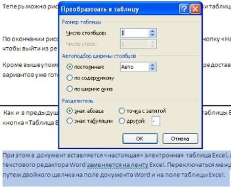 Для этого необходимо выделить нужный блок текста и выбрать пункт меню "Преобразовать в таблицу". В появившемся окне надо задать параметры будущей таблицы. Следует иметь в виду, что, фрагмент должен быть предварительно отформатирован символами-разделителями, чтобы программа смогла различить столбцы таблицы.
