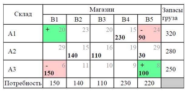 Перемещаем по циклу груз величиной в 90 единиц, прибавляя эту величину к грузу в клетках со знаком "плюс" и отнимая ее от груза в клетках со знаком "минус".