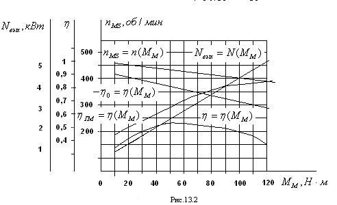 Общая эффективность двигателя оценивается его механической характеристикой в совокупности с характеристиками изменения КПД η и мощности N в функции момента на валу: