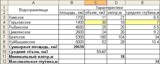 Используя набор данных «Крупнейшие водохранилища России», составить таблицу и выяснить суммарную площадь водохранилищ, средний объем водохранилищ, максимальную глубину и минимальный напор водохранилищ.
