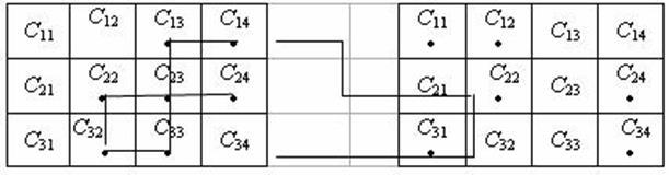 Определение. Циклом будем называть набор клеток матрицы перевозок, в котором две и ровно две соседние клетки расположены в одной строке или в одном столбце, и первая и последняя клетки набора лежат тоже в одной строке или столбце.