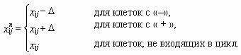 Затем для этой клетки, согласно утверждению 2, строим единственный цикл. Набор клеток в цикле помечаем поочередно знаками «+» и «–», начиная с «+» в свободной клетке.