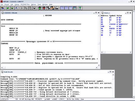 Так как в данной разработке сравнение чисел и управление выходным сигналом выполняется с помощью программы, написанной на языке Ассемблер, то необходима проверка работоспособности этой программы.