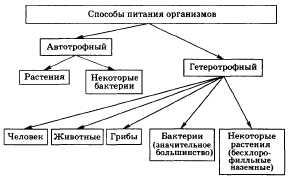 1. Способы питания. Питание — процесс поглощения веществ из окружающей среды, их преобразование в организме и создание из них усваиваемых организмом веществ, специфических для каждого конкретного организма. 2. Автотрофный и гетеротрофный способы питания. Создание органических веществ из неорганических при автотрофном способе питания. Использование готовых органических веществ при гетеротрофном способе питания. Автотрофный способ характерен для зеленых растений и некоторых видов бактерий, а гетеротрофный — для всех других организмов.