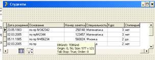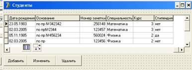 и дать им заголовки: ФИО, Дата рождения, Номер зачетки, Специальность, Курс.