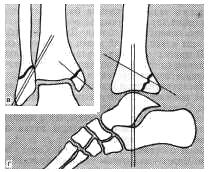 Трансартикулярная фиксация спицами по Каплану при легкосмещаемых переломах лодыжек и заднего края болыдеберцовой кости с подвывихом стопы кзади (а - перекрещивающаяся трансартикулярная фиксация двумя спицами; б - Трансартикулярная фиксация голеностопного сустава через пяточную и таранную кости; в - закрытый остеосинтез спицами внутренней и наружной лодыжек; г - закрытый остеосинтез спицей заднего края большеберцовой кости; д - определение точки введения спиц для трансартикулярной фиксации стоны из подошвенной поверхности).