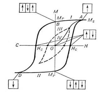 При зміні напрямку намагніченого струму, а, отже, і напрямку напруженості поля і поступовому збільшенні струму зворотного напрямку напруженість поля досягає значення Hc, називаного коерцитивною силою (відрізок ОВ), при якому магнітна індукція B = 0. При подальшому збільшенні струму і напруженості поля магнітопровід намагнічується в протилежному напрямку і при напруженості поля Hг=-Ha, магнітна індукція досягне значення Bг =-Ba. Потім при зменшенні струму і напруженості поля до нуля магнітна індукція Bд стає рівною - Bб. Нарешті, при наступному зміні напрямку струму і напруженості поля і збільшення її до колишнього значення На магнітна індукція збільшиться також до колишнього значення Ba. Розглянутий цикл перемагнічування феромагнетиків по кривій абвгдеа називається гістерезисним циклом (петлею гістерезис).