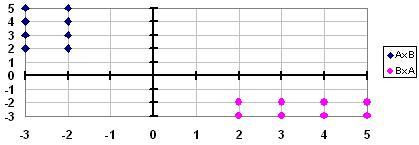 4.Изображаем элементы декартовых произведений АхВ и ВхА в виде точек декартовой плоскости (рис.1). Произведениями множеств являются