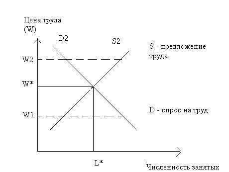 Если заработная плата ниже равновесной цены, например, равна W1, то появляется недостаток рабочей силы (спрос равен D1, а предложение — S2). Спрос заставляет работодателей повышать вознаграждение, чтобы привлечь новых рабочих. И в конечном счете заработная плата снова поднимется до уровня W*. Заработная плата на уровне W* становится доминирующей, общепринятой, с которой должны считаться и работодатели, и работники. При этом уровне заработной платы достигается полная занятость. Так функционирует механизм конкурентного рынка [5, С. 44].