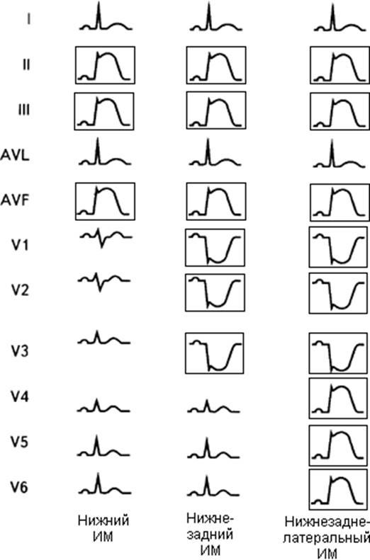 При инфаркте задней стенки (нижнем, диафрагмальном) эти изменения обнаруживаются во II, III стандартном и усиленном отведении от правой ноги (aVF).