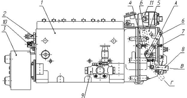 1 - топливный насос высокого давления; 2 - перепускной клапан; 3 - гаситель крутильных колебаний; 4 - болт ограничения максимальной частоты вращения; 5 - регулятор частоты вращения; 6 - рычаг управления регулятором; 7 - болт ограничения минимальной частоты вращения; 8 - скоба останова; 9 - топливоподкачивающий насос; 10 - болт регулирующий пусковую подачу; 11 - корректор подачи топлива по наддуву: А - положение рычага при минимальной частоте вращения холостого хода, Б - положение рычага при максимальной частоте холостого хода, В - положение скобы при работе, Г - положение скобы при выключенной подаче.