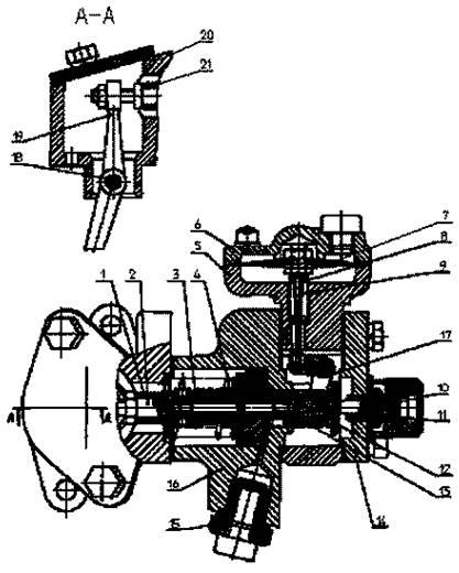 Корректор подачи топлива по наддуву (рисунок 4) установлен на верхней части корпуса регулятора. К проставке 20 с помощью болтов крепятся корпус корректора 16, корпус мембраны 5 и крышка корректора 14. Внутри корпуса корректора расположена прецизионная пара поршень 13 и золотник 12. Через упор 2 поршень поджимается пружиной 4 к корпусу корректора. На упоре установлена гильза 1 упора, которая пружиной 3 постоянно поджимается к регулировочному болту 21 рычага 19. Рычаг установлен на оси 18 в проставке. На одном конце рычага расположен регулировочный болт с гайкой, а другой конец при работе корректора непосредственно воздействует на рейку ТНВД.