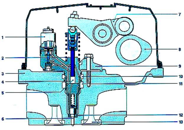 1 — электромагнитный клапан высокого давления; 2 — возвратная пружина; 3 — головка блока цилиндров; 4 — корпус насос-форсунки; 5 — камера высокого давления; 6 — распылитель; 7 — коромысло; 8 — кулачок привода; 9 — прижимная скоба; 10 — канал обратного слива топлива; 11 — канал подачи топлива; 12 — гайка распылителя; 13 — клапан двигателя.