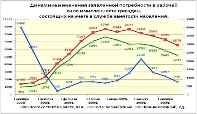 Всего в 2009 году за предоставлением государственных услуг в сфере занятости в органы службы занятости обратилось свыше 14 млн.человек. [24] При этом численность граждан, обратившихся за содействием в поиске подходящей работы, увеличилась в 2009 году по сравнению с 2008 годом почти в полтора раза (8,5 млн. чел. в 2009 против 6,0 млн. чел. в 2008).