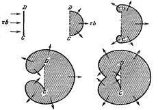 Если бы новые Д. не рождались в кристалле, то пластич. деформация прекратилась бы после выхода на поверхность тела всех подвижных Д. При повышении внешних напряжений интенсивность размножения Д. увеличивается. Объяснение данного процесса впервые было предложено Франком и Ридом. Они рассматривали дислокацию призматического типа, образованной путем сдвига части кристалла от ABC к DEF, причем DEF представляет при этих условиях дислокационную линию. Если сдвиговое напряжение приложено к плоскости скольжения ABED и на части дислокационной линии EF действие силы не проявляется, то данная дислокация рассматривается как неподвижная, или сидячая. Но на дислокацию действует сила и она будет продвигаться вперед. Так как дислокация ED закреплена в точке Е, она будет поворачиваться вокруг этой точки, поскольку приложенное напряжение стремится расширить площадь области, охваченной сдвигом рис.10.